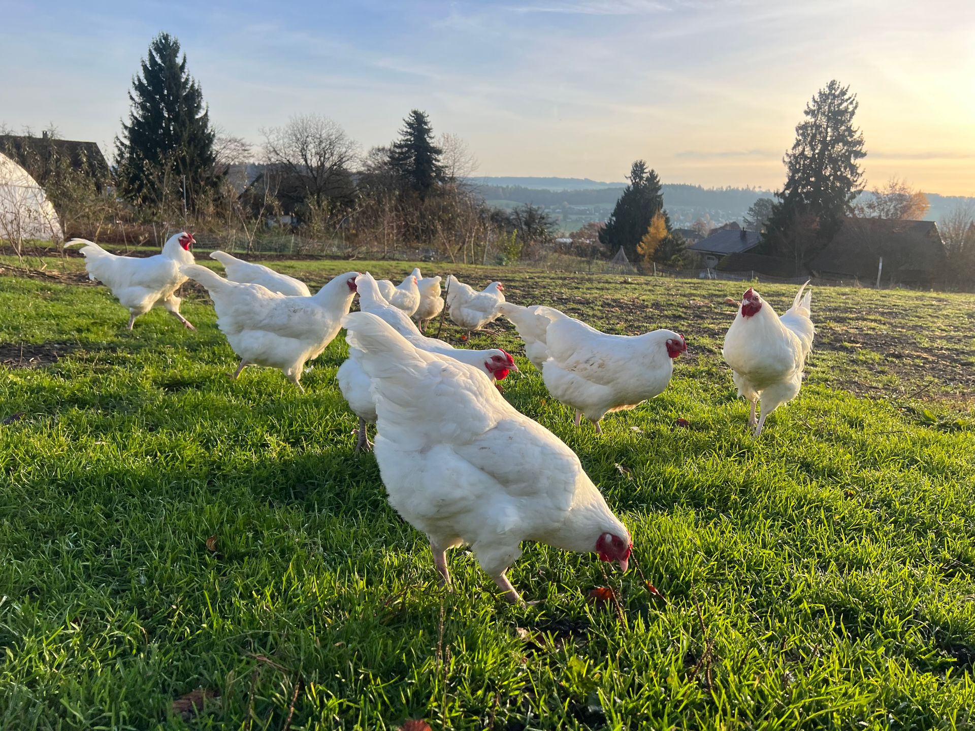 Obwohl der November uns ab und zu in Nebel hüllt, zeigt sich doch auch die Sonne und dann - ja und dann zeigt sich der Garten wieder in seiner vollen Pracht. Unsere Kühe sind wieder zurück im Stall und geniessen das Strohbett, die Schafe geniessen die Herbstweide-Tage und die Hühner legen - welch eine Freude - fröhlich Eier! Eier stehen ab sofort im Folientunnel zum Verkauf für euch bereit. Warum uns das Huhn-Thema so wichtig ist, warum wir Rasse Hühner haben und warum es über die Bruderhahn-Thematik hinaus geht, findet ihr hier.